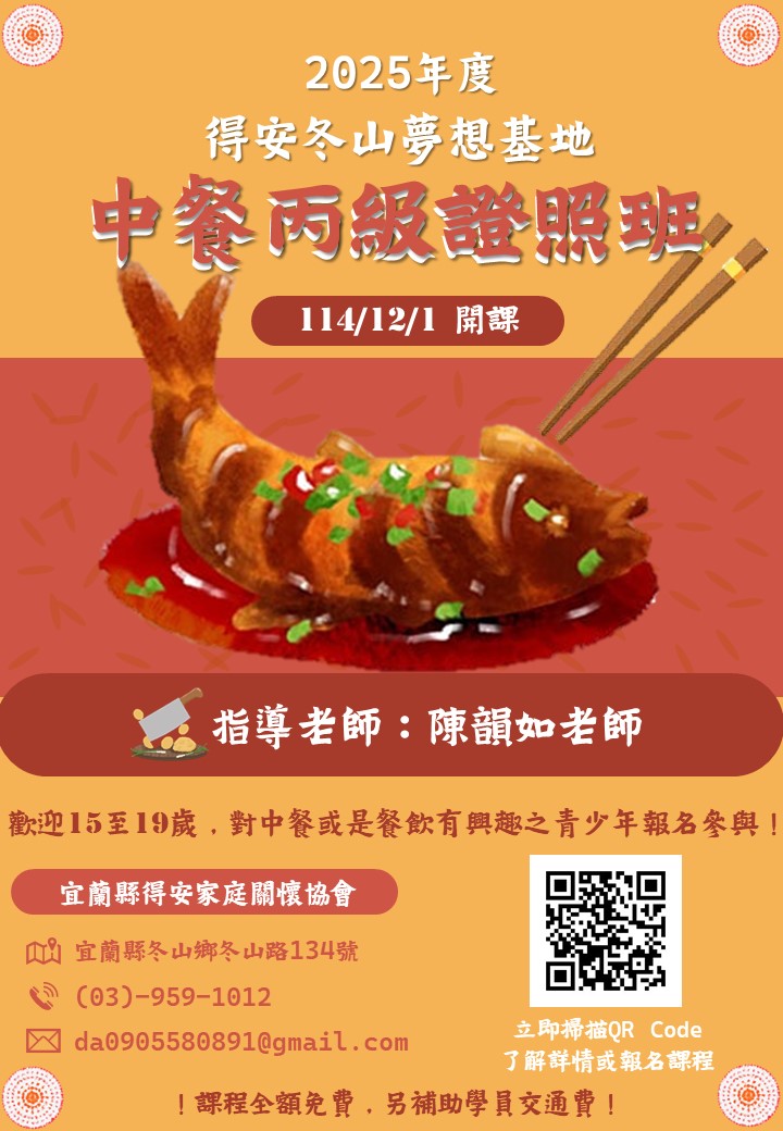 👩🍳招生對象:15-19歲,對中餐、餐飲或是考照有興趣之高中職中途離校、休學生